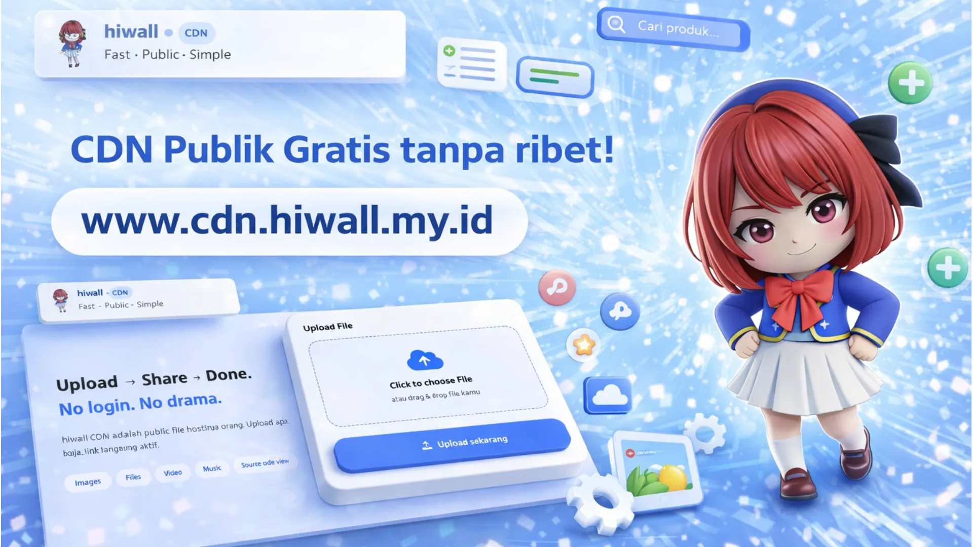 Public CDN uploader tanpa login untuk file, image, dan source code.